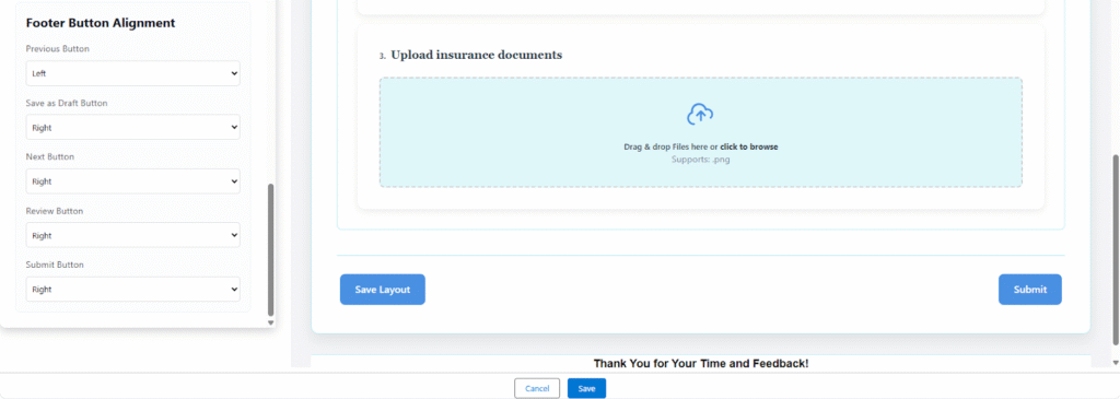 - Save as Draft Button: Horizontal alignment of the button to save partial progress.